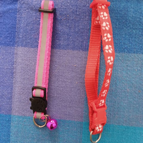 Pari uutta kissan kaulapantaa ja lapio kissanhiekan puhdistamiseen.