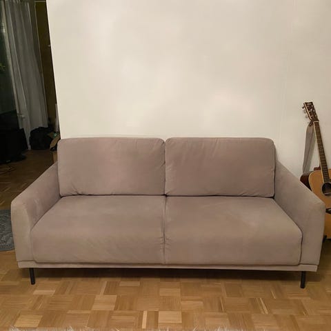 2x Askon sohvaa: vaaleanharmaa kangasverhoilu, metallijalat, irroitettavat niskatuet (toisessa 2 kpl, toisessa 1kpl) metallijalkojen pohjissa olevat suojat irronneet. Hinta 250€ per sohva. Lisätietoja/kuvia kysymällä. :)
