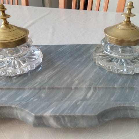 Myyn settinä vanhan mustepullon+kynän , mustekuivaimen ja paperipainon.