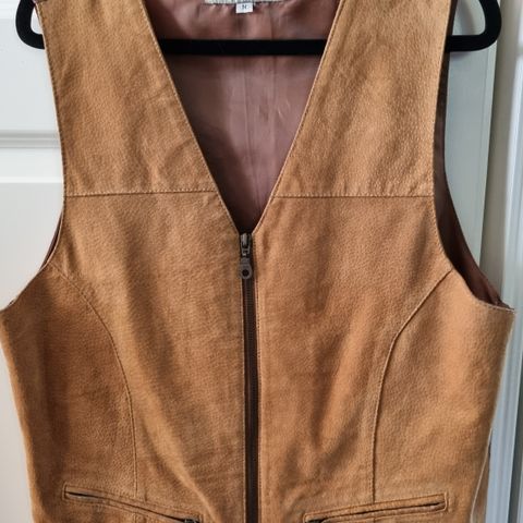Hyväkuntoinen, ruskea mokkanahkaliivi satiinisella sisä- ja selkäkankaalla.
