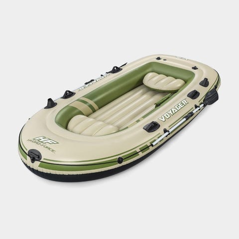 Paketissa vene, airot sekä pumppu