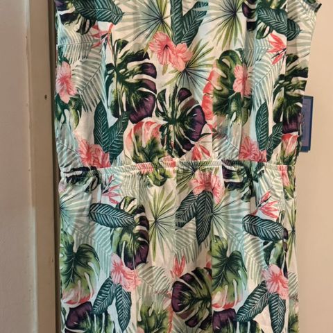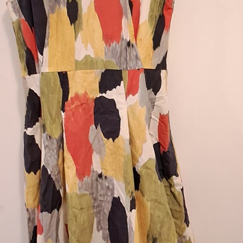 Värikäs mekko M. Vyötäröllä kuminauha ja solmimisnauha. Materiaalilappu leikattu pois, mielestäni viskoosia.