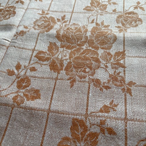 Kaksipuoleinen pöytäliina, jotain pieniä tahroja voi olla. Kaunis kukka kuvioitu. Koko 142x145cm.