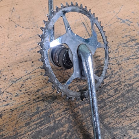 Sataa vuotta läheneviin pyöriin harvinaisia kampia ja rattaita. Huomaa siis normaalista poikkeava rattaan ja kammen välinen liitos. Myös ratas on vakioketjua leveämpi, siis ns. mopoketjulle. Vain 1 kpl 50 hampaista ja pari 48 hampaista ratasta. Kampia muutama.