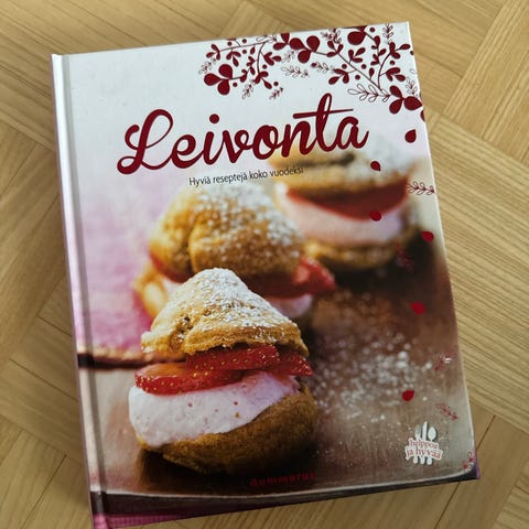 Kirjassa leipomiset jaoteltu eri osioihin, suolaiset, makeat, piirakat, kakut, leivokset jne.