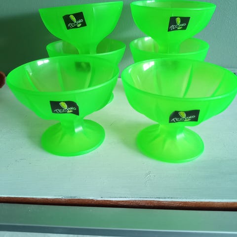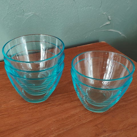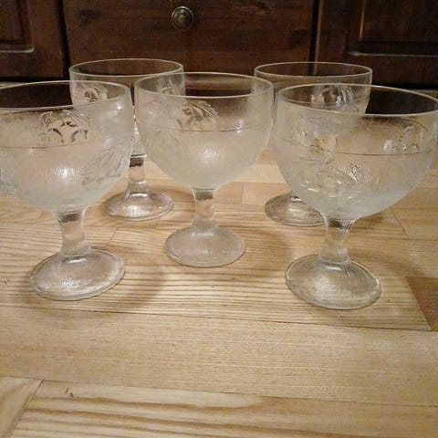 Myydään 8 kpl vanhoja jälkiruokakulhoja, kirkasta lasia, n. 10 cm korkeat ja 6 cm syvät, jalka n. 4 cm.