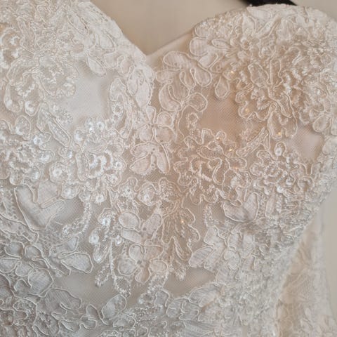 Laadukas ja hyväkuntoinen Ranskalainen kaunis hääpuku, jossa pitsikirjailua, koko 36 mutta saa sivusaumoista suurennettua 38 kokoon. Mekon alle saa vannehameen mutta voi käyttää myös ilman vannetta.