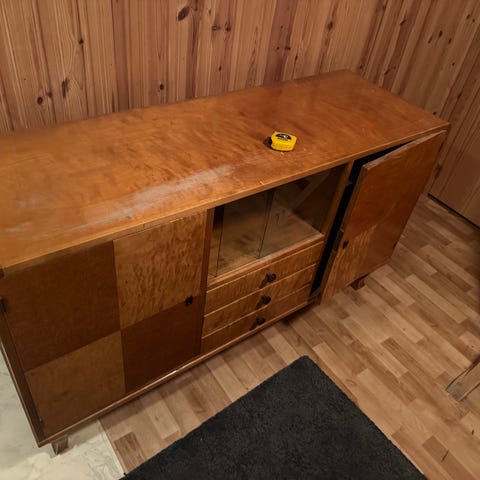 Vanha puinen senkki, jossa on koristeelliset yksityiskohdat. Sopii hyvin olohuoneeseen tai ruokailutilaan säilytysratkaisuksi. Molempien ovien takana hyllyt ja toisen oven takana lisäksi pieni laatikko, jos on saa pikku tavaraa tai papereita säilytykseen. Toisen oven lukko rikki, toinen toimii, avain tulee mukana. Ennen ollut koivun värinen, puuseppä käsitellyt noin 10 vuotta sitten pinnan ja koristekuviot. Nopea haku!