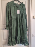 Ihana, uusi tummanvihreä Junarosen mekko koko 42. Lappukin vielä paikoillaan. Todella kaunis kuosi ja pitsiset yksityiskohdat helmassa ja hihansuissa