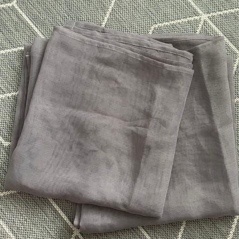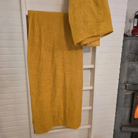 Keltaiset verhot. Alareunassa 10 cm päärme, yläreunassa verhonauha. Nurja puoli kiiltävä.