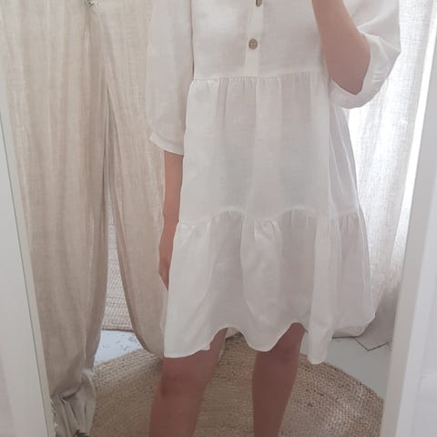 Kauluksessa pieni röyhelö, takana solmittavat nauhat.
