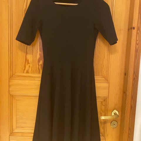 Olkaimellinen hulmuavan musta mekko, jonka yläosa on rypytetty ja venyvää kangasta.