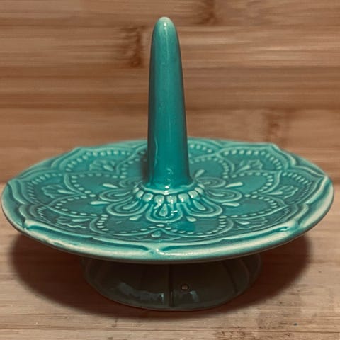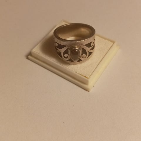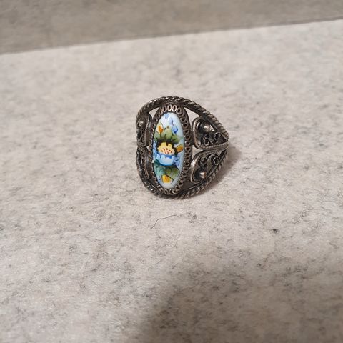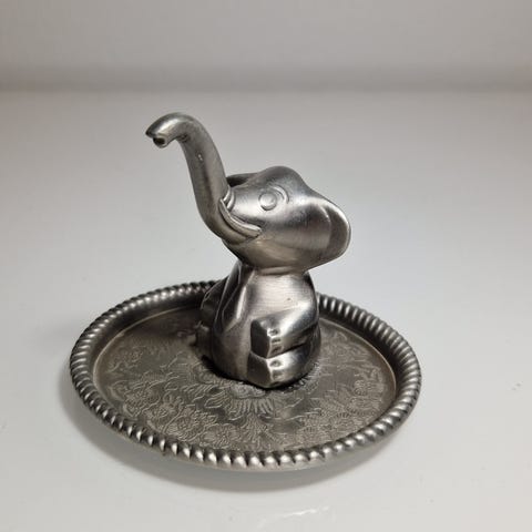 Ajan patinoima hopeoitu delfiini, joka toimii sormustelineenä.
