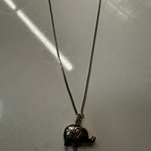 Suloinen norsu-kaulakoru, jossa on pitkähkö lukollinen ketju. Norsu tuntuu metalliselta ja on väriltään harmaa.