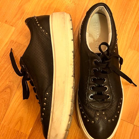 Geox Tennarit kengät, koko 37. Väri valkoinen. Materiaali ei ole erikseen mainittu, mutta kengissä on rei'itetty pinta hengittävyyttä varten. Naisten tai unisex-malli. Sopivat vapaa-ajan käyttöön.