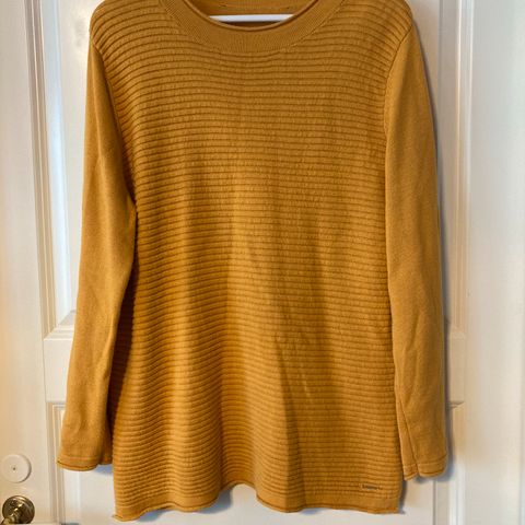 Myydään erittäin hyväkuntoinen sinapinvärinen neulepaita, jossa 3/4 osa hihat.