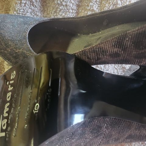 40 koko, nahkaiset korkokengät, koron korkeus takaa mitattuna 8,5 cm, sling back remmeissä säätö ja joustin, Tamaris -merkkiset, mukava lesti, pintanahkapäällinen, nahkainen sisäpohjallinen, keinonahka vuori hillitsee kengän liiallista venymistä/löystymistä, ovat hieman käytetyt, mutta hyvin kauniit jalassa ja kengissä onkin hyvä juttu, että ovat hieman sisäänajetut, eivätkä uutuudenjäykät, Tamaris on laadukas merkki, kauniin himmeän metallisen pronssin hohtoiset/mustat, viilujäljitelmä korko, kantalaput hyvät ja kunnolla kiinni, pieni kuluma ei haittaa mitään (on parempikin, että kantalapussa kulumaa hieman, niin korko ei ole uutuuden kova ja liukaspintainen).