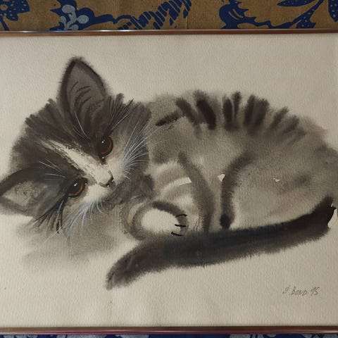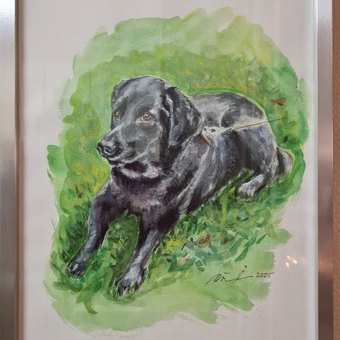 Akvarelli 43,4 cm x 33,5 cm kehyksissä, joiden väri hopean ja kullan hohtoinen. Omaa tuotantoa.