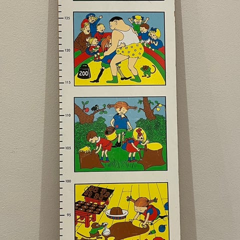 Kauniit eläinkuvitukset ja mitta-asteikko 70–150 cm. Täydellinen lastenhuoneen sisustukseen, leikkimökkiin tai keräilyyn. Erittäin hyväkuntoinen, alkuperäisessä muovikääreessä – käyttämätön vintage-tuote!
