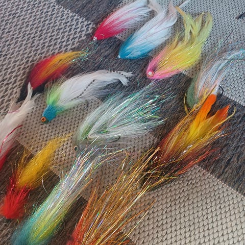 Viisi muotoon leikattua keinokuituperhoa, näitä on merihauet saattanu purra joskus mutta kunto on hyvä ja koukut terävät. Kaksi perhoista painavia yli 15cm, kolme pienempää 11- 12cm. Plus muutama bonusperho.