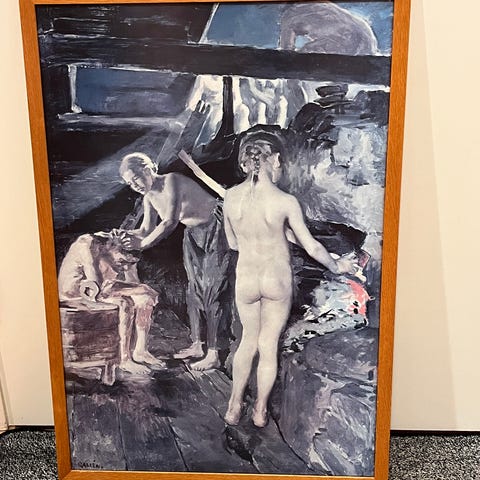Maalaisromanttinen taulu vanhasta pirtistä .Hintaa saa tarjota .M .Pikkaraisen taulu