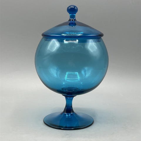 Sininen vintage lasipurkki. Koristeena marjoja ja hedelmiä (persikka, kirsikoita, päärynä, viinirypäleitä, lehtiä). Siisti ja ehjä.