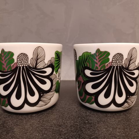 Käyttämättömät Marimekko Veljekset korvattomat kupit, 2 kpl. Hienon kuosin on suunnitellut Maija Louekari.