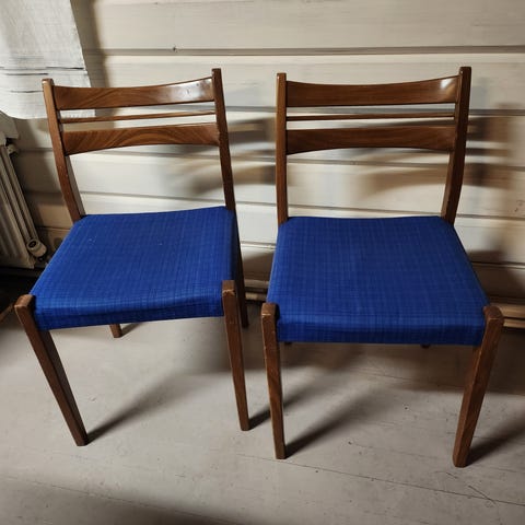 Hyväkuntoiset maalatut koivutuolit. Istuimiin vaihdettu pehmusteet ja kankaat