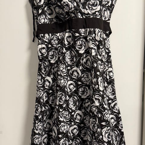Vero Modan valkoinen mekko mustalla vyöllä. Kauniisti laskeutuva mekko. Silikoninauha rinnan yläosassa. Takana vetoketju.