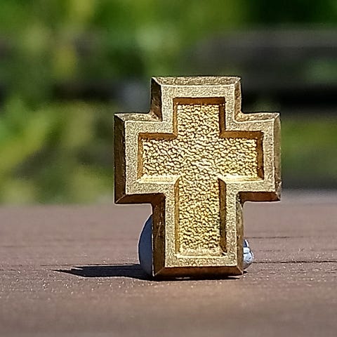 Kullanvärinen Pappi tunnus. Halkaisija - noin 15 mm. Ehjät piikit. Laattamainen