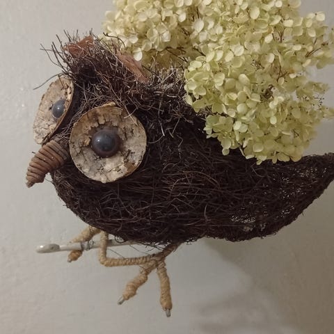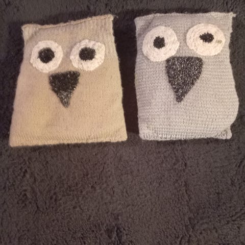 Tummanharmaa pöllö, jonka korkeus noin 7cm. Kimmellystä pinnassa.