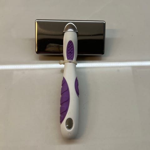 Metallinen yksirivinen pohjavillahara isolle tai jättikokoiselle koiralle. Harjaosan leveys noin 11cm ja piikkien pituus noin 1,5cm.