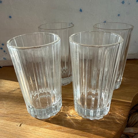Seitsemän snapsilasia, Arabian Spektra. Korkeus 7 cm ja halkaisija 3,8cm.