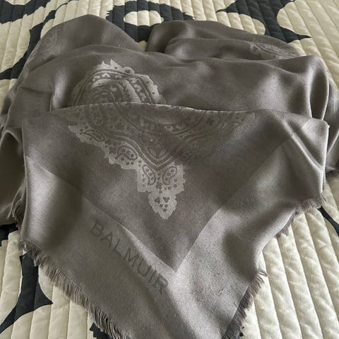 Myyntiin Balmuirin Capri-huivi, värissä smoke. Koko 140x140. Yhdessä kulmassa pieni langannousu, josta kuva. Tästä irrotettu pesulappu. Huivi ollut kerran käytössä, joten langannousua ( ja säilytyksessä rypistymistä) lukuunottamatta, uuden veroinen huivi. Ei vaan tule itsellä käyttöön.