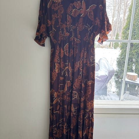 Mos Mosh Hatty Azzy Dress, pari kertaa pidetty juhlissa joten erittäin hyväkuntoinen mekko, koko L. Mustassa mekossa on kullan värinen kukka-aihe. Mekossa on suora A-linjainen leikkaus, jossa on v-pääntie, jota koristaa rinnan ja olkapäiden leveät, tuuheat röyhelöt.