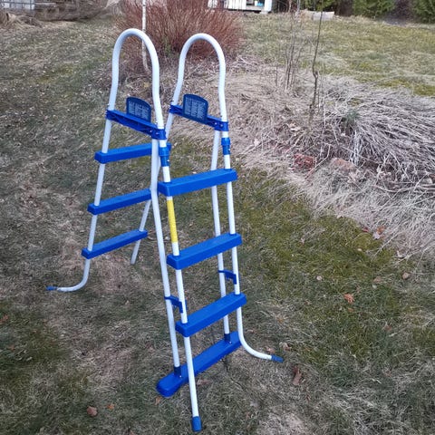 Uudet allastikkaat 107cm kolmella porrasaskelmalla per puoli ja välitasanteella. Tukevaa alumiinia, mutta kevyet käyttää.