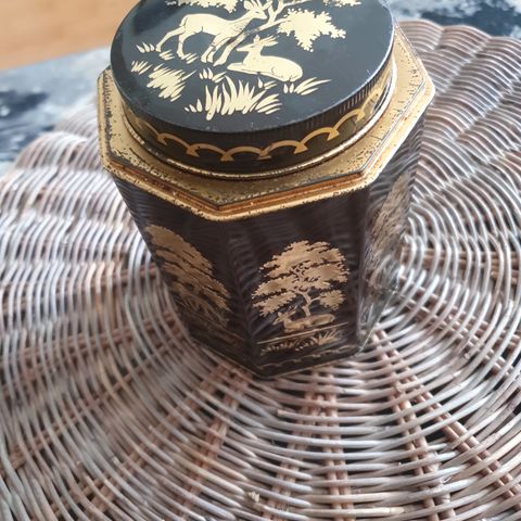 Vanha peltirasia, jonka kuva-aiheena lintujen metsästys. Vähäistä käytönjälkeä. Mitat: 15 x 14 x 8,5 cm.