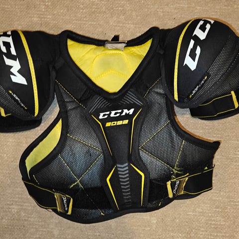 CCM hartiasuojat. Toisessa olkapäässä kankaassa reikä (kuva). Tarrat pitää hyvin vielä. Koiratalous.