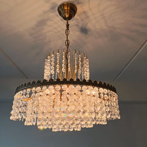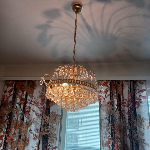 Käyttämätön kristallivalaisin kattoon, ei ole pistoketta, joten sen tai sokeripalan joutuu hankkimaan. Ovh oli n 269. Kasatessa huomasin että 2 vartta oli tehtaalla asennettu väärin, ne poistettu koska en saanut irroitettua ja vaihdettua niitä päittäin, vaikutus; yhdet kristallikoristeet vähemmän kuviossa.