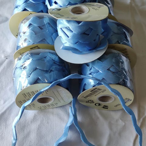 Myydään kuvan koristenauhat. Toinen vaalea beige, leveys noin 2,3 cm. Rullassa 20 jaardia (noin 18,2 metriä). 100 % polyesteriä satiinia. Rulla lähes täysi. Toinen vihreä, leveys noin 1,5 cm. Rullassa 100 jaardia. Käytetty rullan säteestä noin 1 cm. 100 % asetaattia.