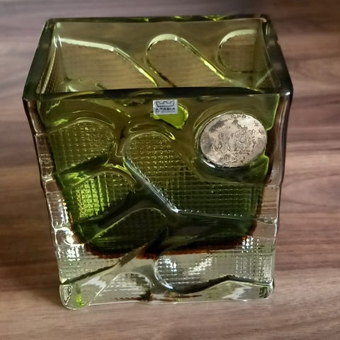 Korkea kirkas lasimaljakko. Korkeus 24 cm, halkaisija 12, 5 cm. Painava. Hinta 15 euroa.