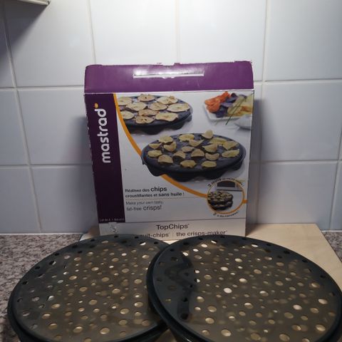 Tällä ritilällä pystyy valmistamaan chipsejä suoraan perunasta kotimikrolla ilman rasvaa. Pakkaus sisältää kaksi ritilätasoa. Ritilän halkaisija on 28cm ja nämä voi laittaa päällekkäin. Käyttöohjeet pakkauksessa. Tuote täysin käyttämätön ja ritilät vielä muoveista koska ei mahtunut omaan pieneen mikroon.