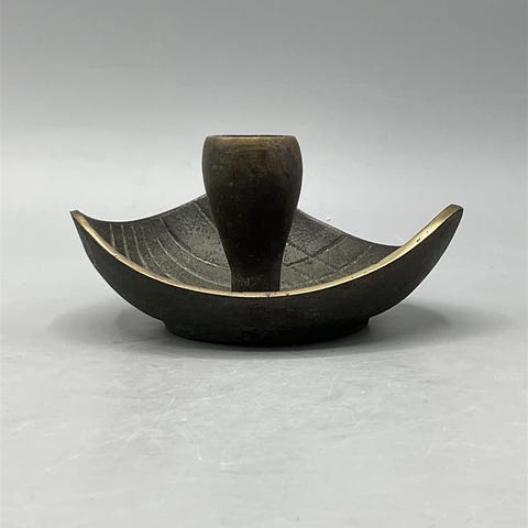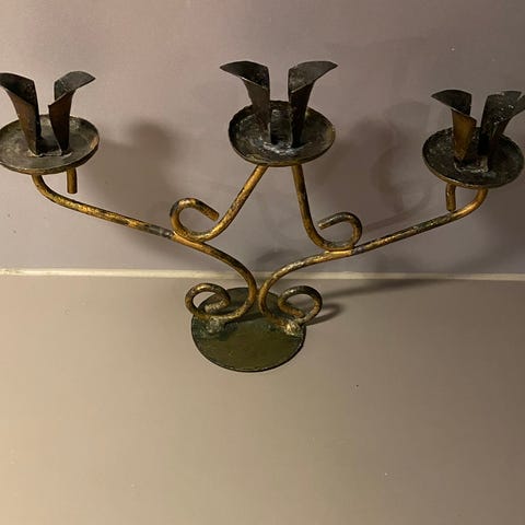 Kahvallinen kynttilänjalka. Metallia, luultavasti sinkkiä. Pyöreän osan halkaisija 11,5 cm. Keskikohdan kork. 3,2 cm ja halk. 2,3 cm. Leveys kahvan kera 14,6 cm.