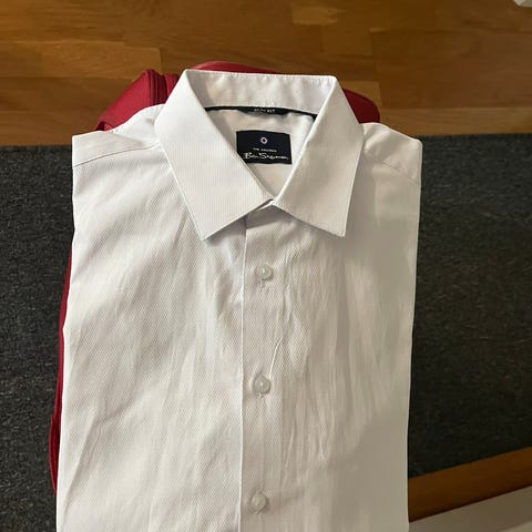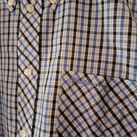 Ben Sherman -merkkinen, ruudullinen kauluspaita. Sini - lilat, pienet ruudut. Paidan materiaali on 100% puuvillaa. Mukana varanapit. Pyöristetty helma.