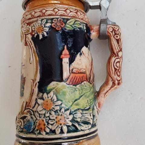 Saksalainen Marzi und Remy (perustettu 1879) -merkin keraaminen oluttuoppi tinakannella. Kuvituksena ketunmetsästys (hevosia, ihmisiä, koiria ja kettu). Siisti ja ehjä.