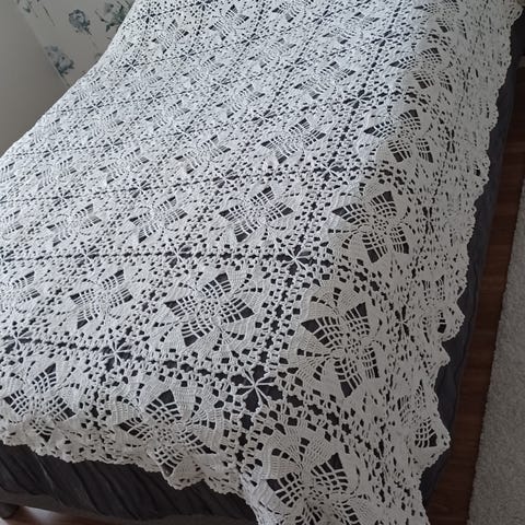 Vaaleankeltainen virkattu päiväpeitto.Ei silitetty, mutta pesty.Kuvat muokkaa väriä.Kalastajalangasta.