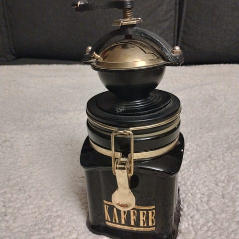 Vanha vintage kahvimylly posliinia, lasia ja puuta. Kaunis tuulimylly kuva. Voi jauhaa kahvipapuja. Kysy lisätietoja!