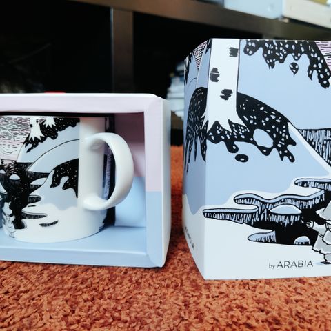 Myynnissä tuotannosta poistunut Arabian muumimuki Muumin päivä 2021. Muki on uusi. Tarra on paikoillaan.