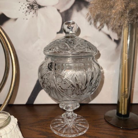 Upea 1900- luvun alkupuolelta todennäköisesti oleva lasi/kristalli astia. Metalliosat jotain niklattua valumetallia. Painaa n. 700g.