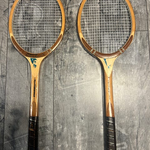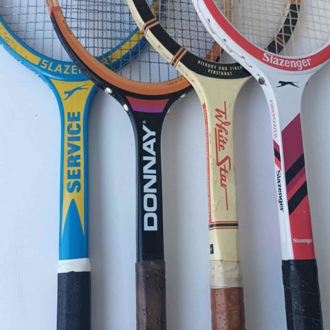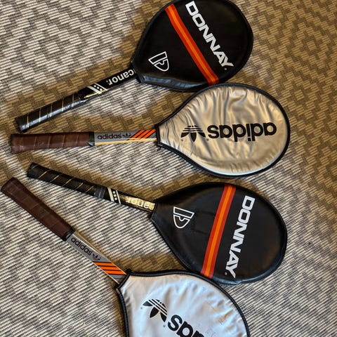 Kuvanmukaiset Donnay tennismailat vaikka tennisfanin seinää koristamaan. Käytön jälkeä näkyy kun näillä on aikanaan pelattukin.